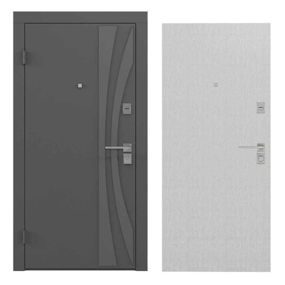 Вхідні двері RODOS BAS 001 – вулична модель преміум-класу для приватного будинку від офіційного дилера Dverione. Колір зовні – темно-сірий G1298 з антивандальною фарбою MIKROTON 110 мкм, всередині – теплий каштан білий МДФ 12 мм. Товщина полотна 65 мм з мінватою 20 кг/м³, замки Securemme (Італія) + Kale (Туреччина) 4-го класу, натискна ручка ILAVIO хром матовий – ідеальний баланс ціни, тепла та безпеки.